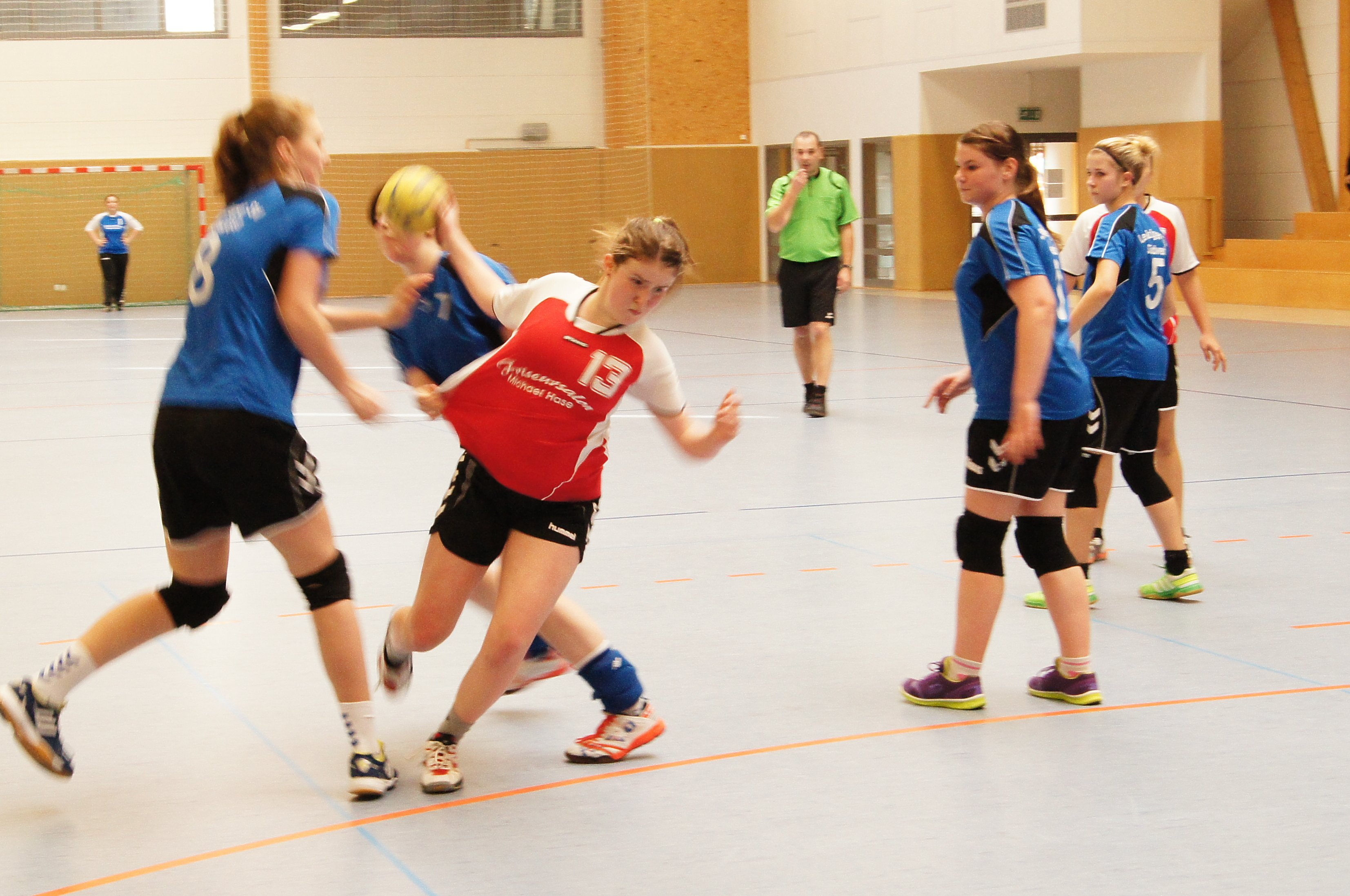 Beide Teams begannen hochkonzentriert und kämpferisch. Der erste Treffer für Südwest fiel durch einen 7-Meter. Nach 5 Minuten stand es erst 1:1 – wenige Chancen durch die guten Deckungen auf beiden Seiten. Und so ging es weiter. Unsere Mädels standen wie eine Mauer in der Deckung, aber versäumten es vorn die Tore zu werfen. Südwest bekam in der ersten Halbzeit 5 7-Meter, die sie alle verwandelten uns so kam es zum Halbzeitstand von 4:5. Kein einziges Tor der Gäste aus dem Spiel heraus.