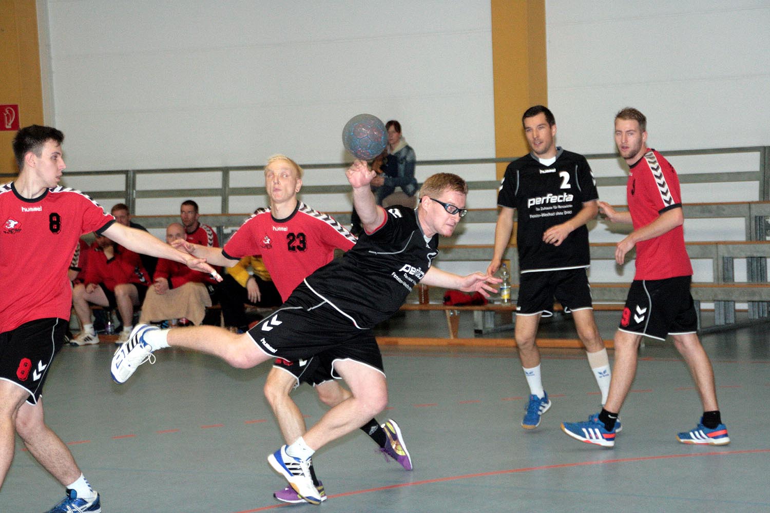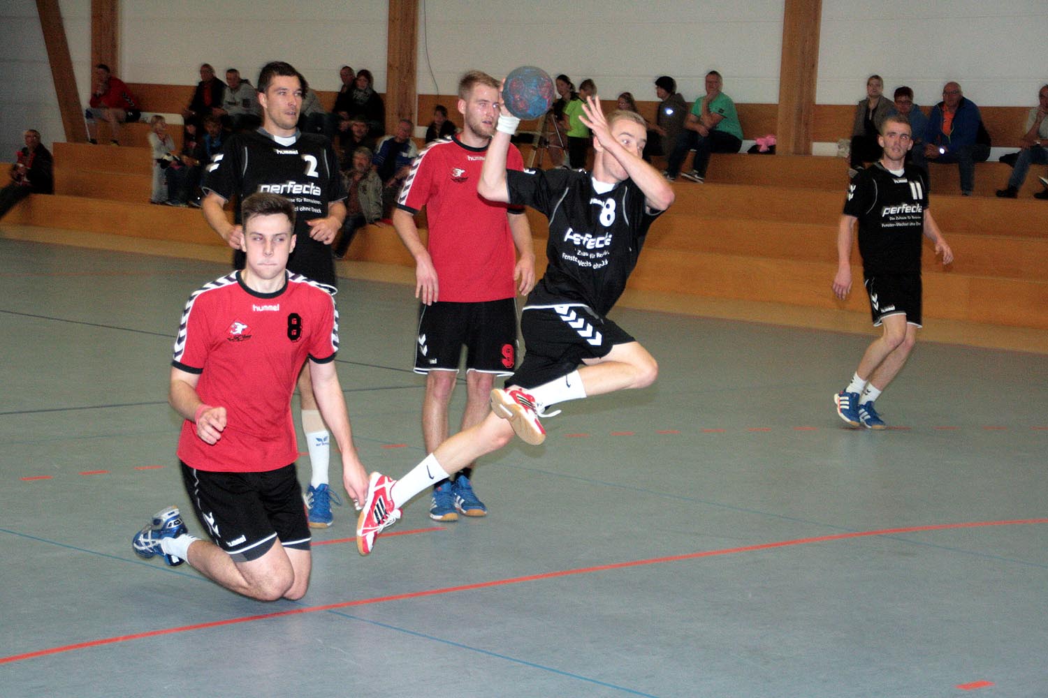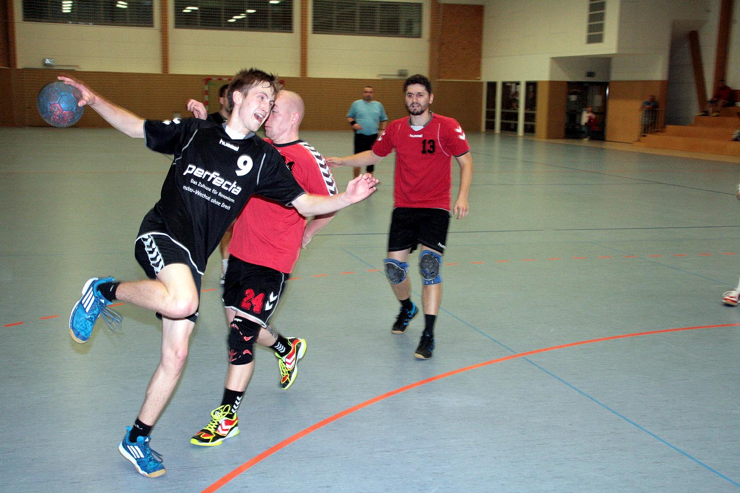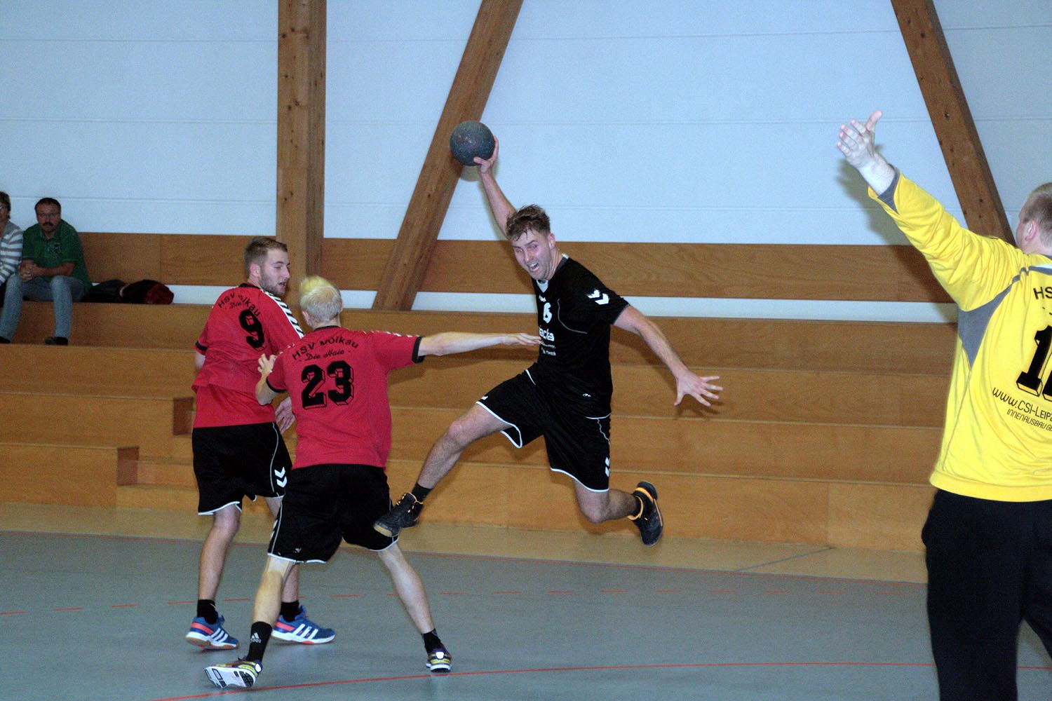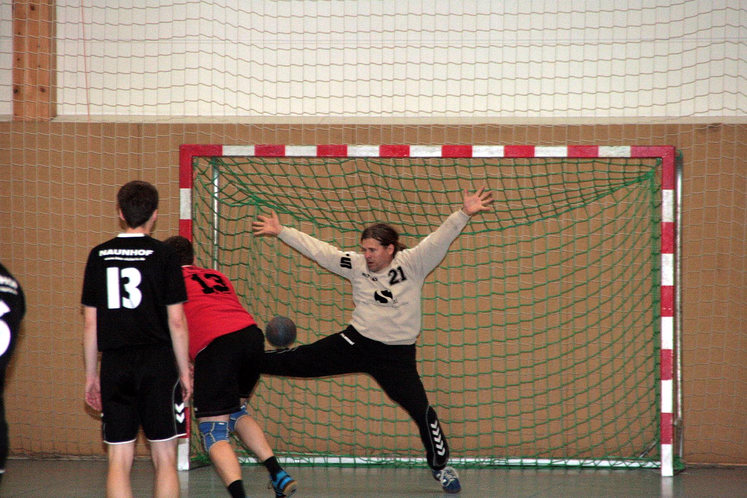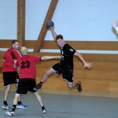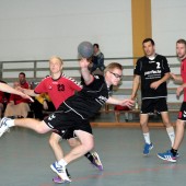 Jedoch verlief der Start der Begegnung alles andere als geplant. Nach zerfahrenen ersten Minuten lagen die Gastgeber bereits mit einem Rückstand von 5 Toren zurück (1:6, 2:7). Doch nach diesen kleinen Startschwierigkeiten fingen sich die Naunhofer relativ schnell wieder und suchten aufgrund einer defensiveren 6:0 – Formation der MölkauerHaie wie, von Anfang an geplant, ihr Glück mit Würfen aus der so genannten 2. Reihe. Auch die Defensive der Naunhofer fing sich so langsam und ließ nicht mehr so viel wie in der Anfangsphase zu. Dennoch war das Spiel sehr geprägt von viel Zerfahrenheit und Spielunterbrechungen. Dies wirkte sich natürlich auch auf den Spielrhythmus aus und verleitete beide Mannschaften zu unkontrollierten Abschlüssen und Fehlwürfen. Positiv zu erkennen warnatürlich das Aufholen der Gastgeber, erzielt durch viele Würfe aus dem Rückraum und überwiegend schnellen Umschaltspiel der Gastgeber, welches kurz vor der Halbzeitpause auch zu einer Disqualifikation für die Gäste führte. Dennoch verbuchten die Naunhofer einen 13:14 – Rückstand zur Halbzeitpause.