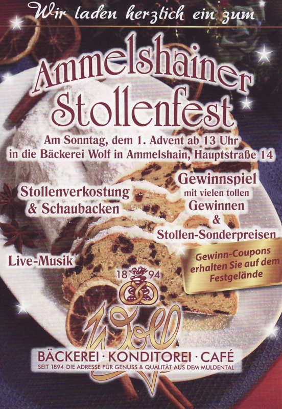 liebe Fans und Freunde des weihnachtlichen Gebäcks. Anbei ein kleiner Tipp für die Vorweihnachtszeit. Am 1. Advent findet wieder das beliebte Stollenfest der Bäckerei Wolf in der Backstube und im Hof in Ammelshain, Hauptstraße 14 statt. Der Eintritt ist wie immer frei. Da das Stollenfest gut besucht und die Parkplätze meist knapp sind, fährt von Naunhof ab Bahnhof auch ein kostenloser Bus-Shuttle zu jeder vollen Stunde.