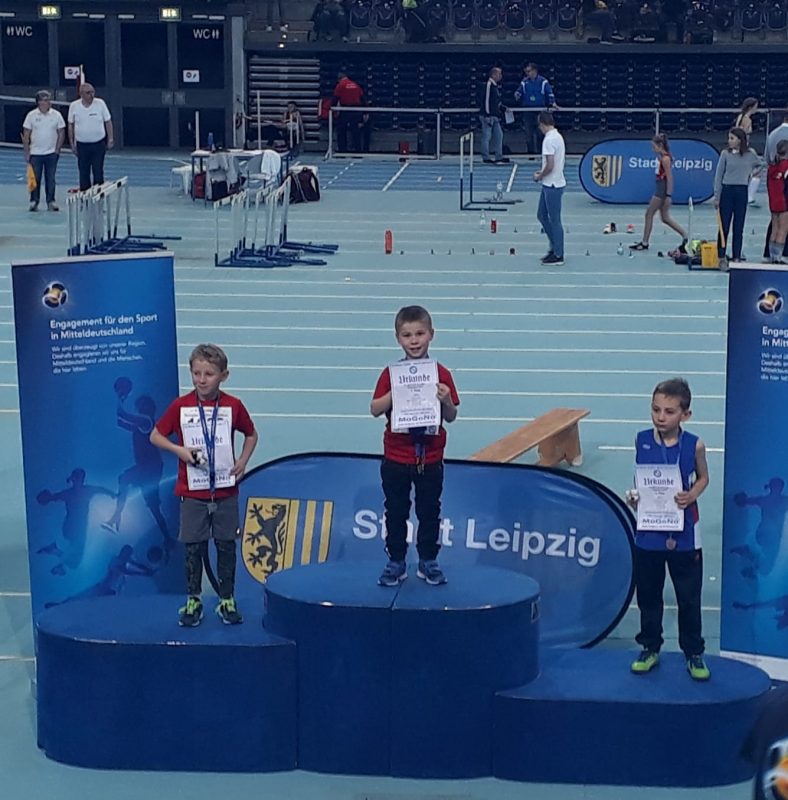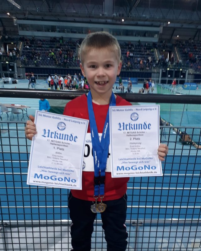 Emil Rößler (M8) gelang es, im Weitsprung mit seinem 3,10m Sprung die erste Medaille für den BSC zu erkämpfen. Auf dem Siegerpodest mit Silber geschmückt durfte er bei der Siegerehrung vor großer Kulisse seinen Erfolg genießen. Viel Zeit, den Erfolg zu feiern blieb ihm jedoch vorerst nicht, denn es standen für ihn noch weitere Disziplinen an, wobei er vor allem im 600m Lauf die Aufmerksamkeit vieler auf sich zog. Emil teilte sich die drei Hallenrunden sehr gut ein, kämpfte sich vor der letzten Runde auf Platz 2 vor und flog dann auf der Zielgeraden förmlich an den bis dahin deutlich in Führung liegenden Athleten heran. Die Anfeuerungsrufe der Naunhofer waren nicht zu überhören und Emil holte in einem packenden Finish mit 4 Hundertstel Vorsprung in 2:12,39 min den Sieg und durfte bei seiner zweiten Siegerehrung ganz oben auf dem Treppchen stehen.